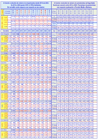 De 2014 a 2023 perde 8 851 (-0.78%) habitantes. Social por concello entre 2014 e 2023. Porcentaxe de pensionistas
