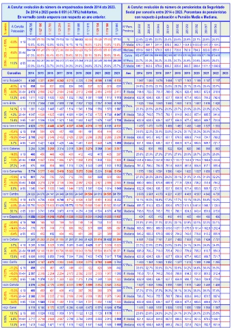 De 2014 a 2023 perde 8 851 (-0.78%) habitantes. Social por concello entre 2014 e 2023. Porcentaxe de pensionistas