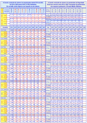 De 2014 a 2023 perde 8 851 (-0.78%) habitantes. Social por concello entre 2014 e 2023. Porcentaxe de pensionistas