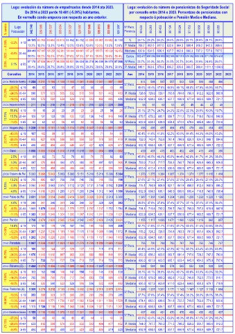 En vermello cando empeora con respecto ao ano anterior. respecto á poboación e Pensión Media e Mediana.