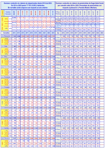 En vermello cando empeora con respecto ao ano anterior. respecto á poboación e Pensión Media e Mediana.