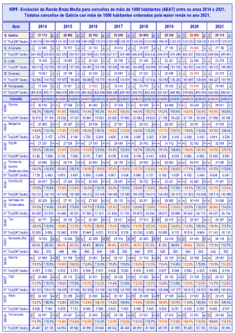 IRPF. Evolución da Renda Bruta Media para concellos de máis de 1000 habitantes (AEAT) entre os anos 2014 e 2021.